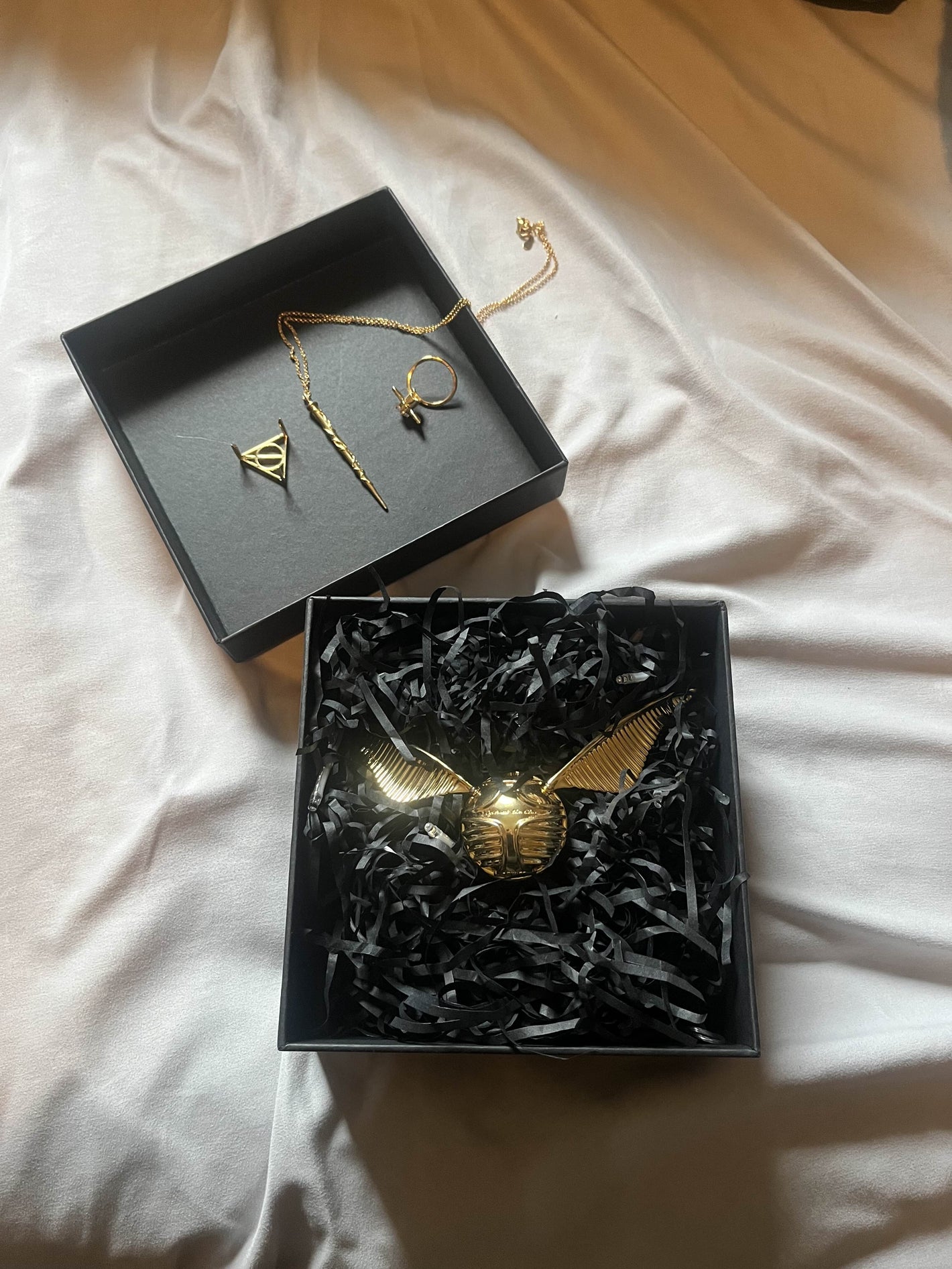 Unlock the Golden Snitch with the included wand necklace, and reveal a sparkling spinning ring hidden inside — designed to calm your mind, spin endlessly, and shine like real wizardry. ✨
